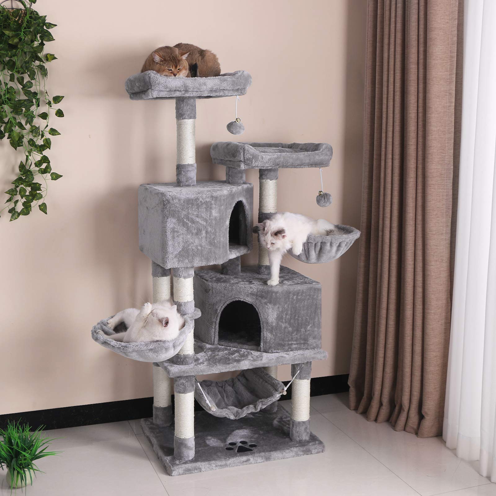 This tall slim cat tree includes a base stand, multiple flat perches and mats on them, a large cat condo, a comfortable hammock, a hanging rope and a hanging toy for extra fun.